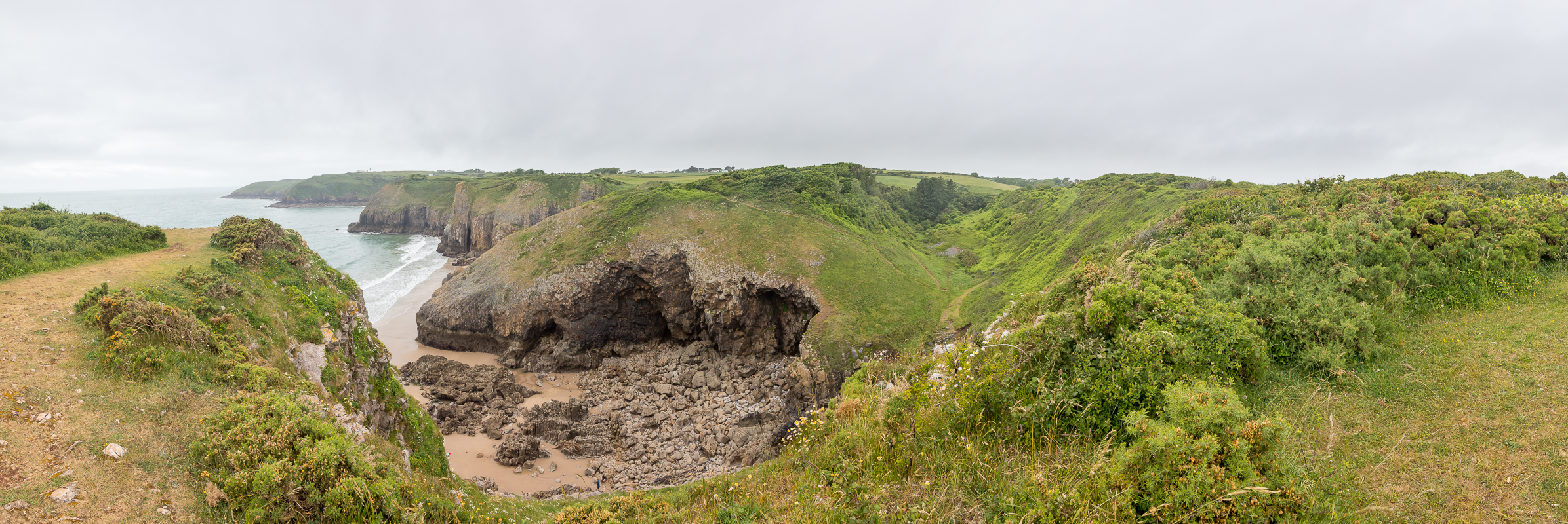 On the cliffs above Skomar beach near Lydstep. Anna is on the path on the right, just starting the walk to Manorbier. Although we can't see it this is directly above the cave that Nick abseiled into the following day.