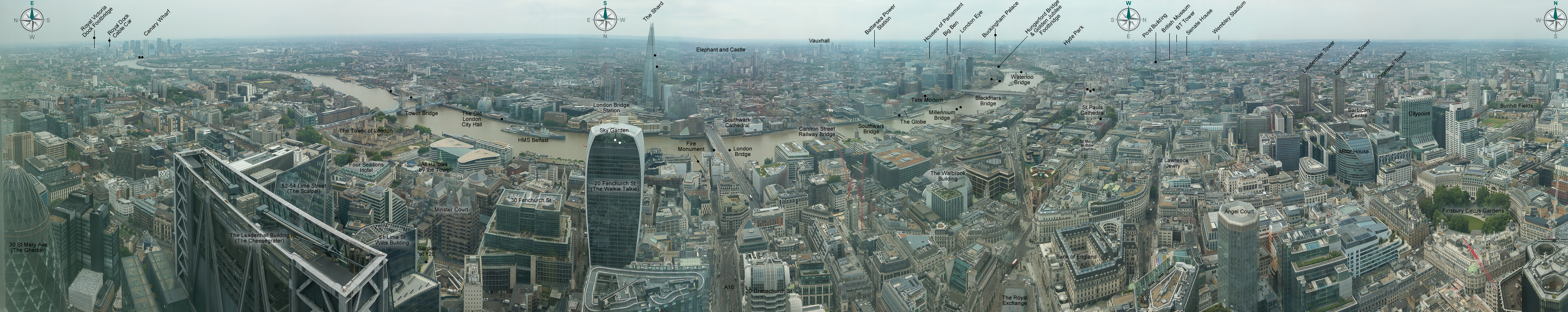 Looking down from Horizon 22, the highest viewing point in London. This is an image constructed from 3 panoramas taken a few minutes apart. Taken through glass.