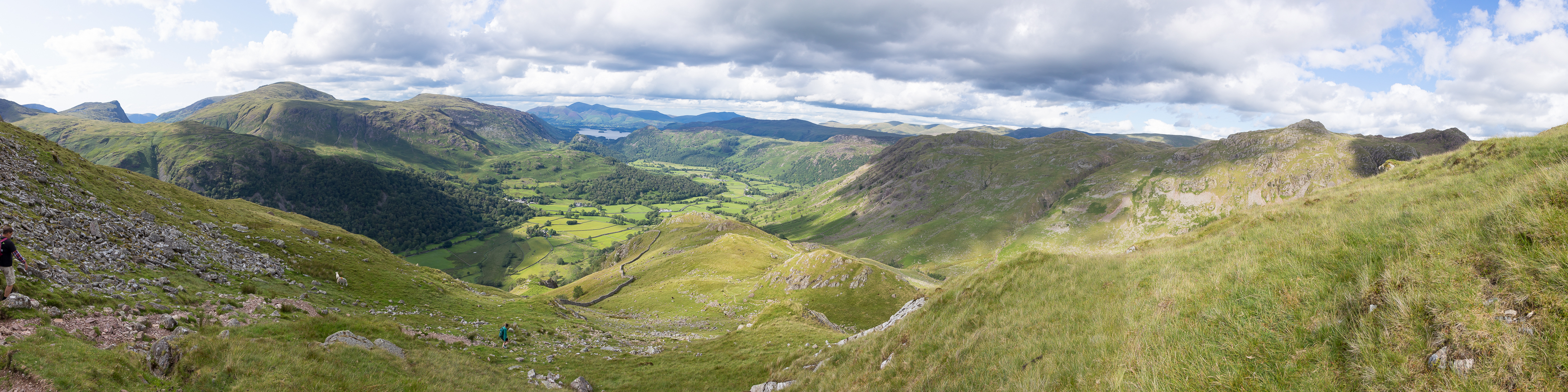 Dropping down from Combe Head along the ridge of Thorneythwaite Fell towards our hotel, visible on the valley floor.