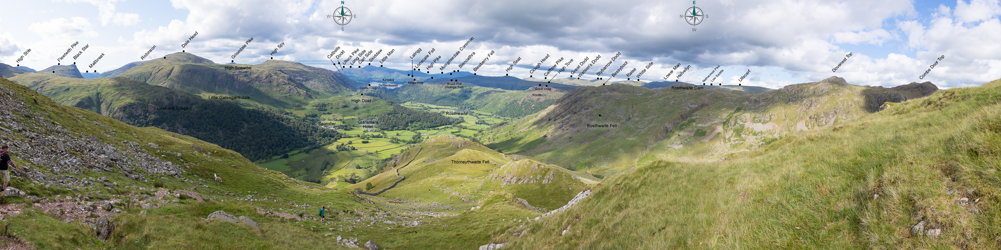 Dropping down from Combe Head along the ridge of Thorneythwaite Fell towards our hotel, visible on the valley floor.