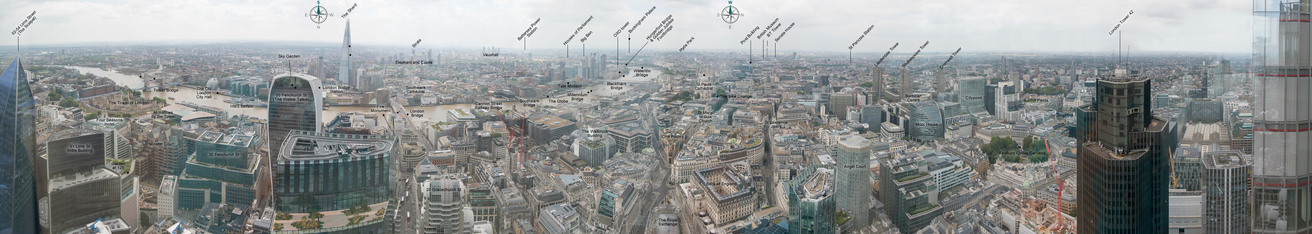 View from The Lookout on the 50th floor at 8 Bishopsgate. This is a similar view to Horizon 22 but a bit lower and a bit closer to the river. Taken through glass. This page has 21 yellow hotspots. Pass your mouse cursor over one for a zoomed view.