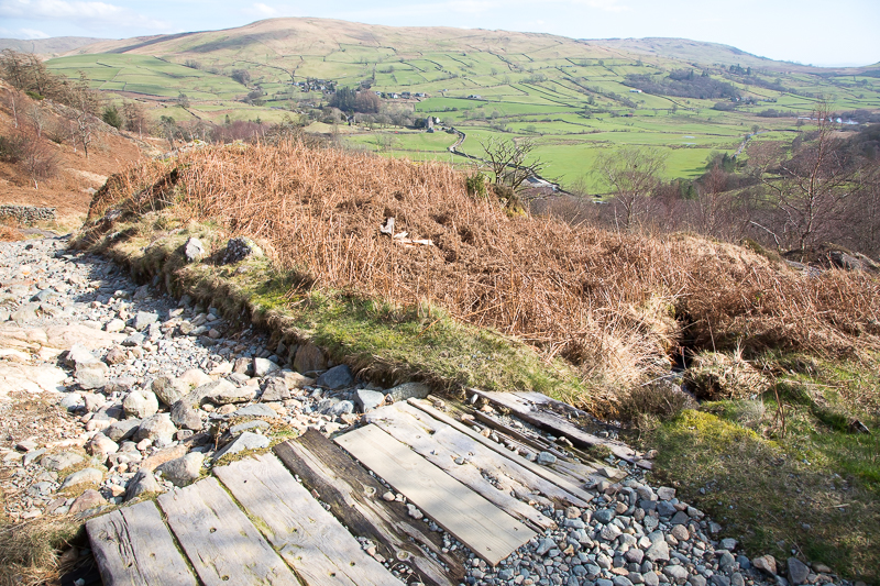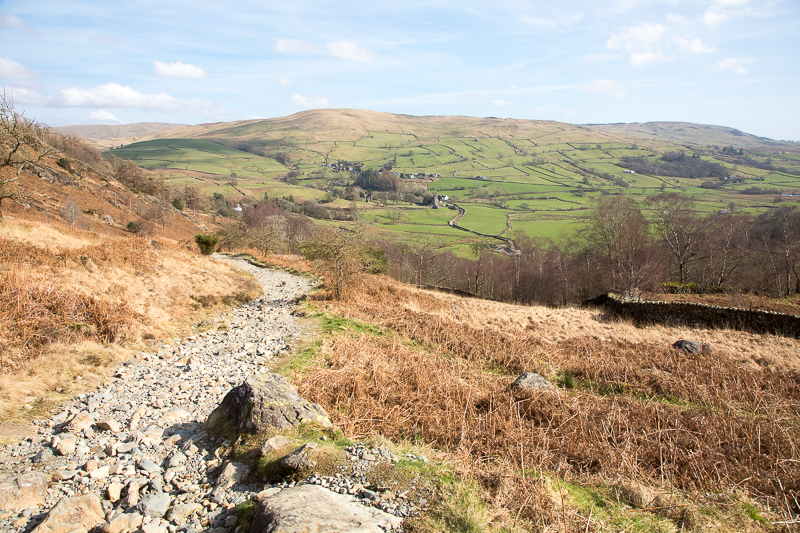 | 17.07 Heading down towards Kentmere on the return. The road ends here and turns back to path. |